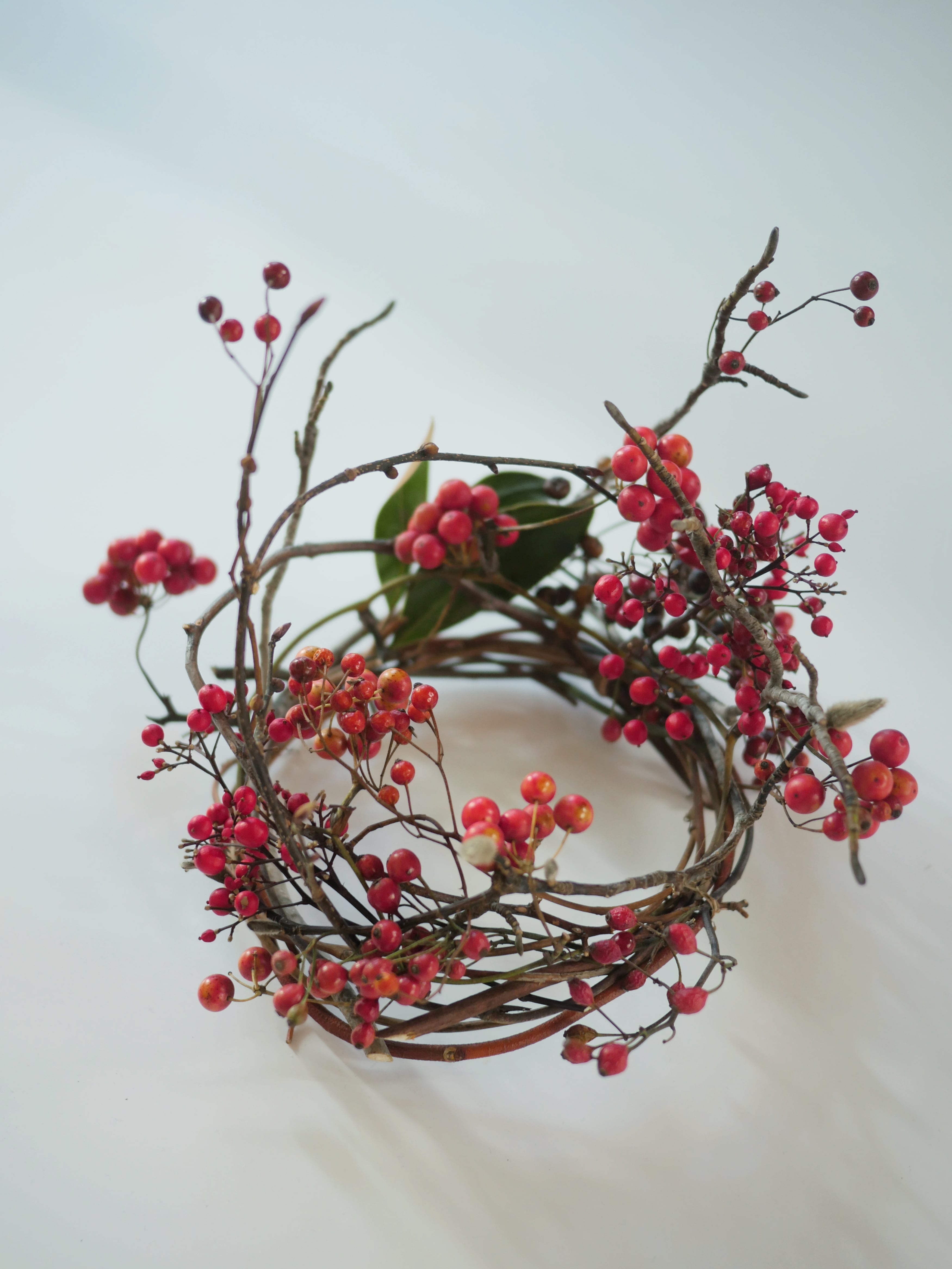 山採りの3種の赤い実とコブシの冬枝のリースです