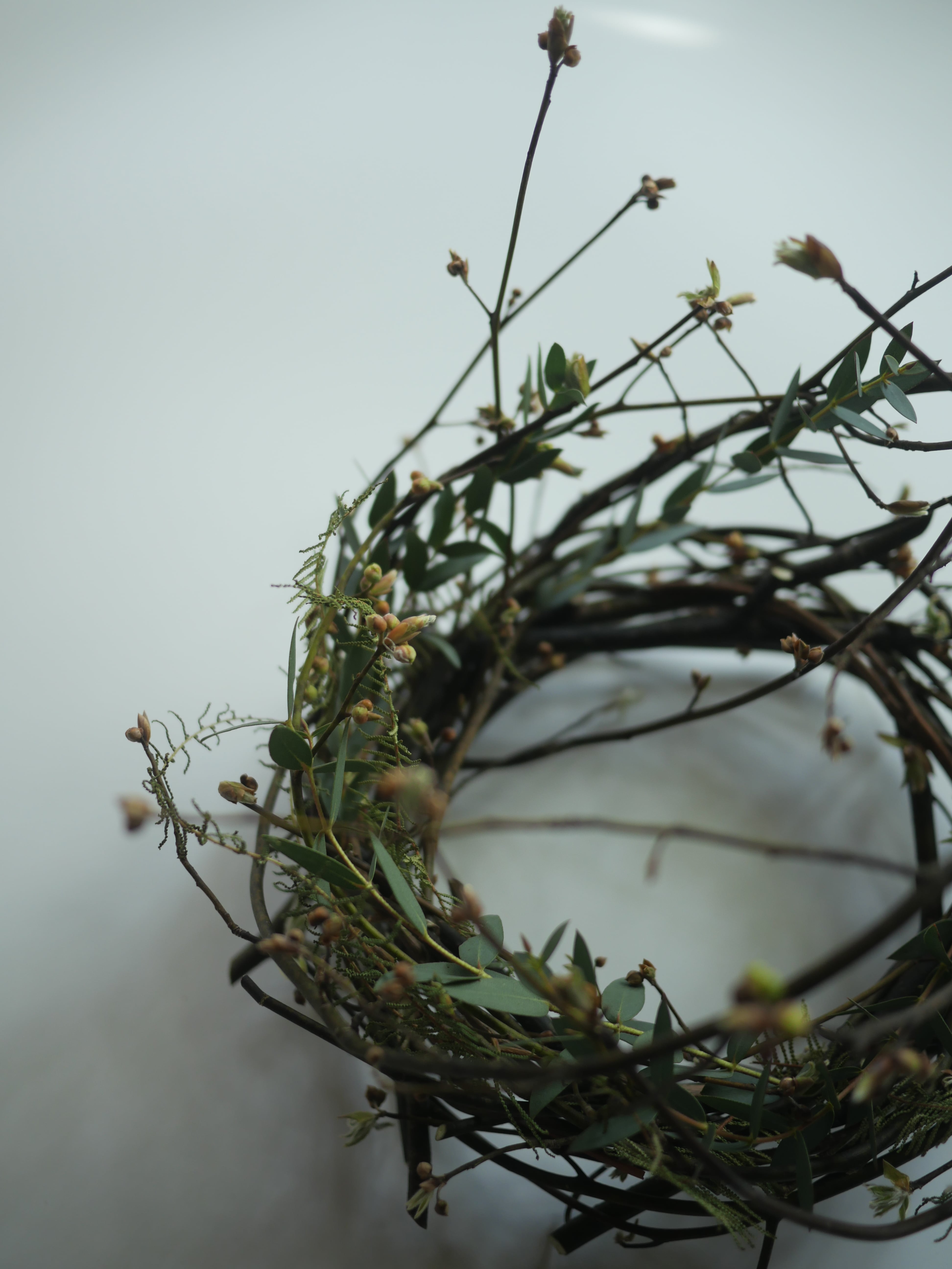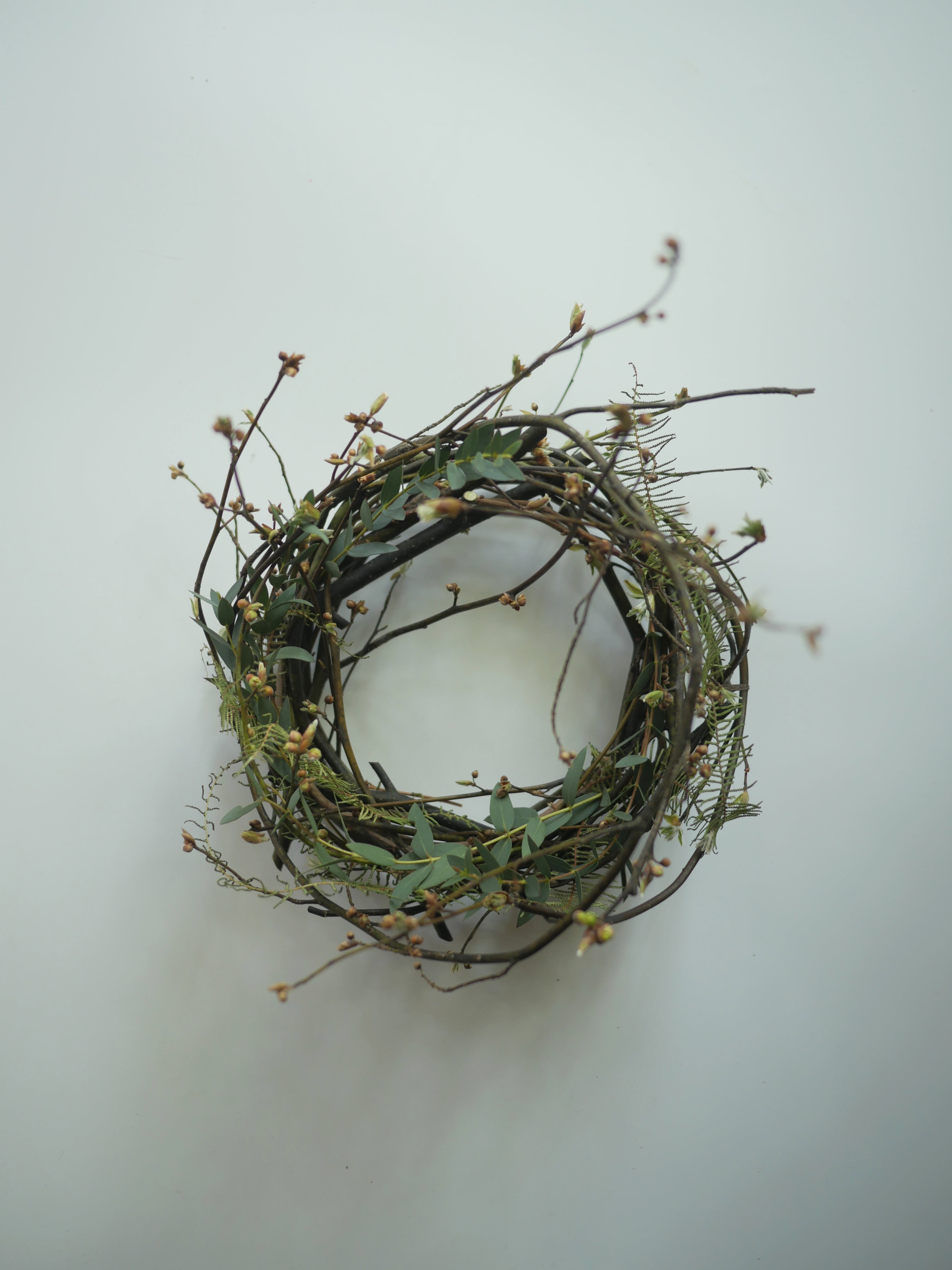 新芽が出始めた季節のクロモジの枝で仕立てたリースに、ユーカリと羊歯をほんの少し添え今の季節をイメージしました